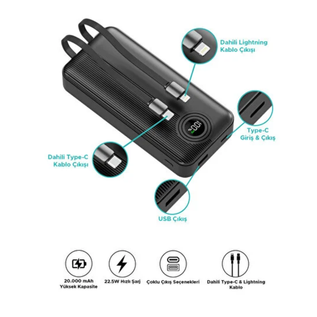 Dahili 2 Kablo (Type-C + Lightning): Her an her yerde kablosuz konfor.