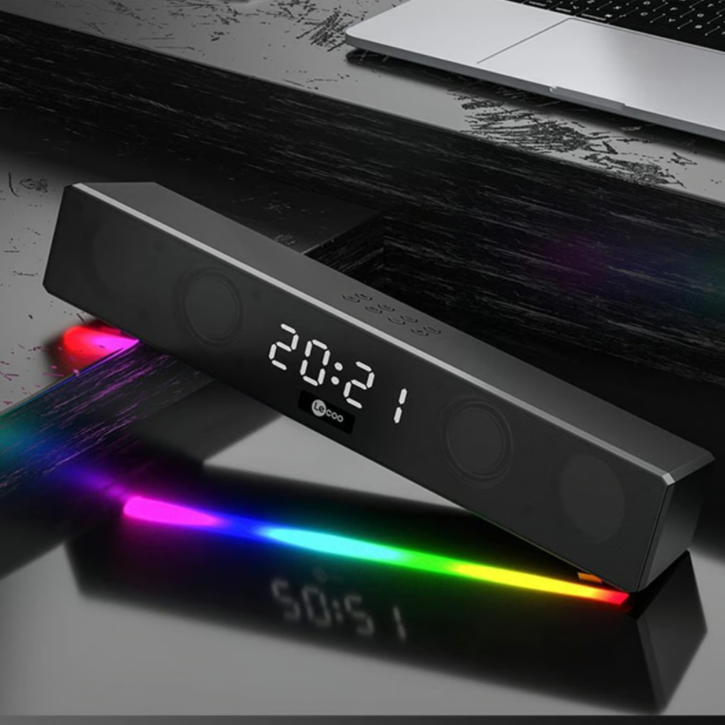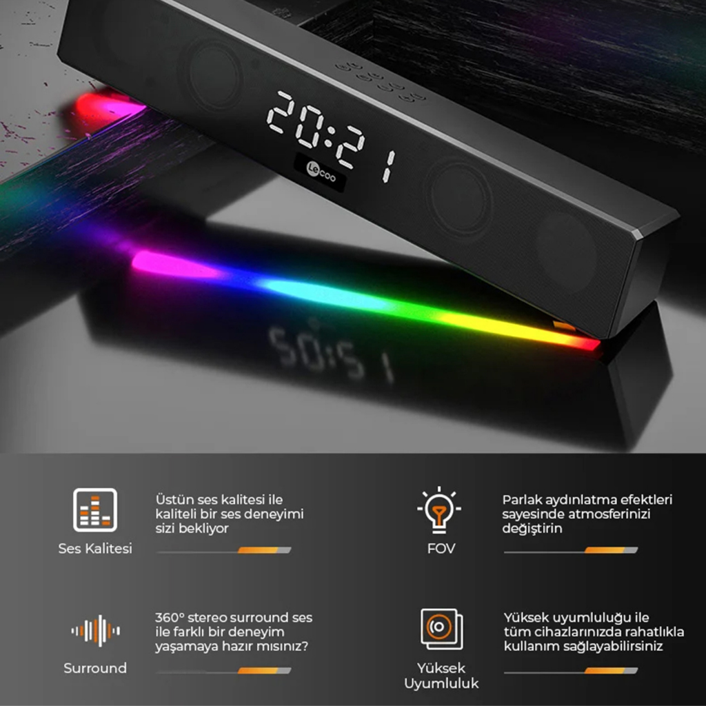 Lecoo DS103 RGB Bluetooth Soundbar, 5Wx2 çıkış gücü ve geniş frekans aralığı ile mükemmel bir ses deneyimi sunar. 75dB gürültü oranı sayesinde, her notayı net bir şekilde duyabilir, evinizde sinema keyfi yaşayabilirsiniz.